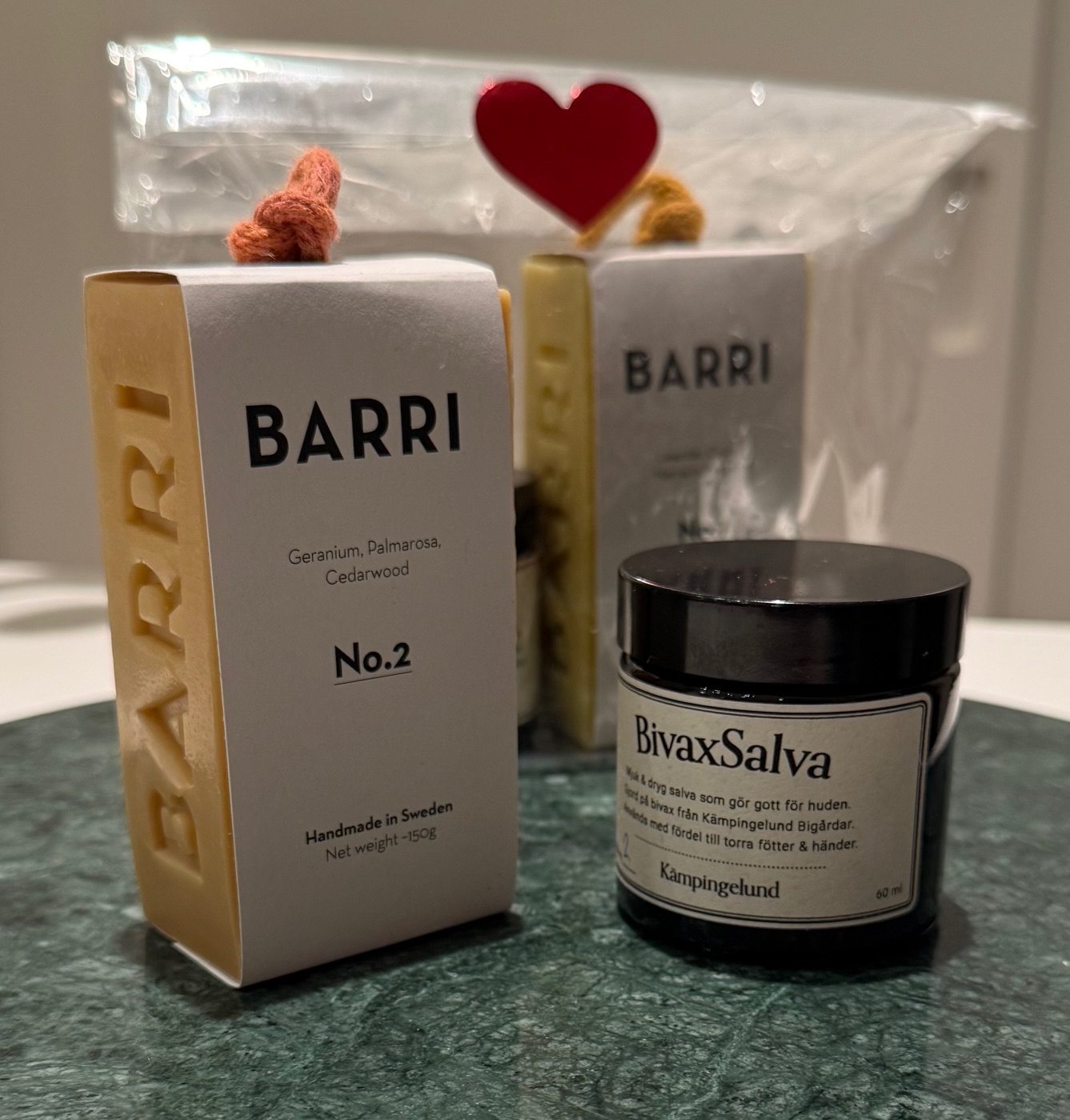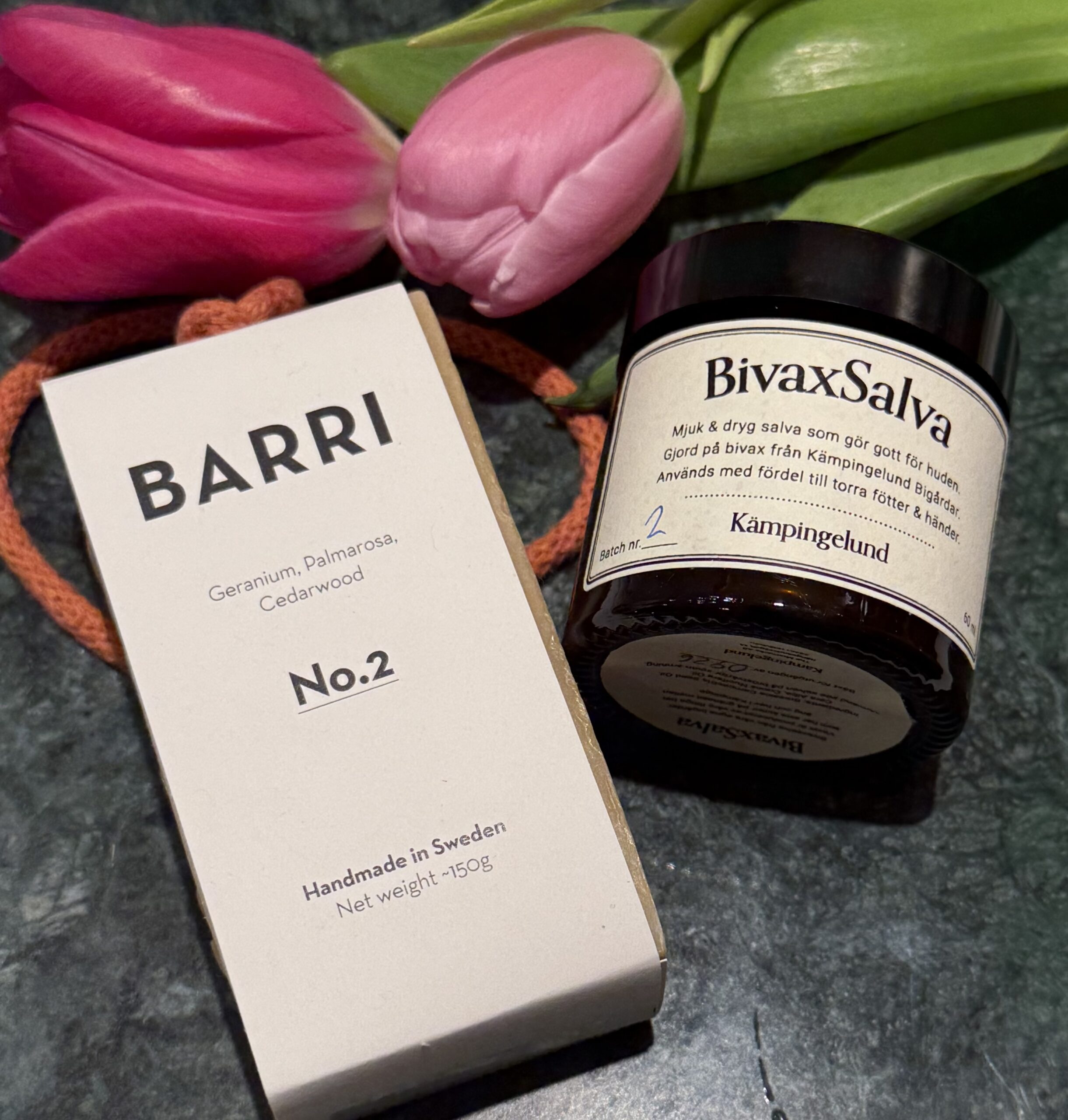 Skriv om du vill ha Barri No.1 eller Barri No.2 i påsen när du beställer. Givetvis går det jättebra att köpa 2 tvålar eller 2 salvor också!